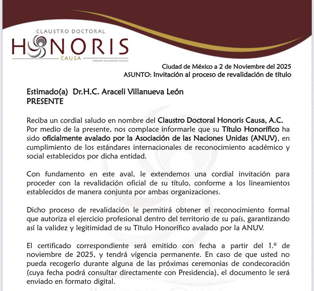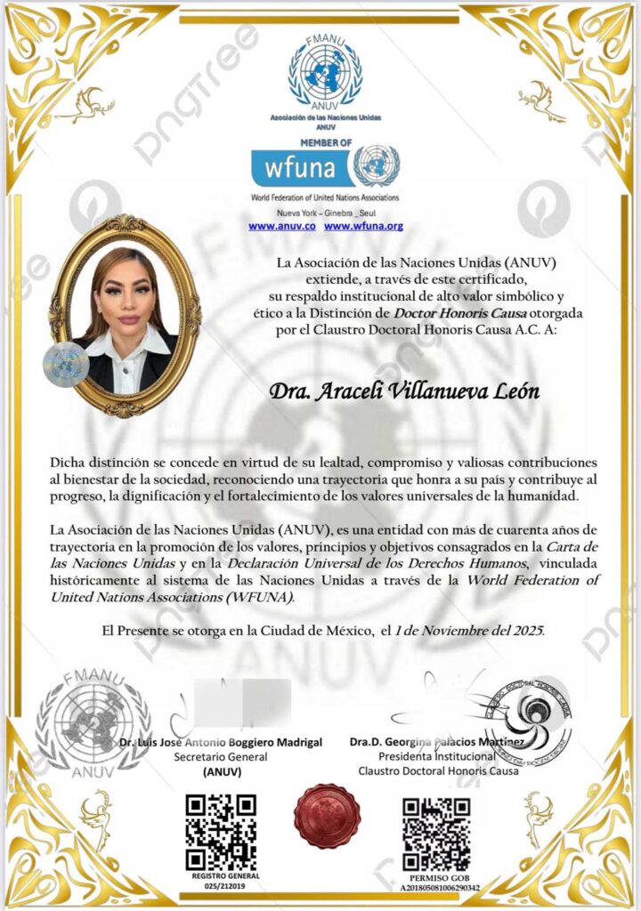 El Claustro Doctoral Honoris Causa A.C. ha extendido a la Dra. Araceli Villanueva León una invitación formal para iniciar el proceso de revalidación oficial de su Título Honorífico, recientemente avalado por la Asociación de las Naciones Unidas (ANUV).